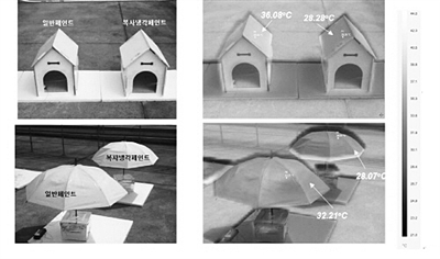 房屋模型對(duì)比試驗(yàn)紅外熱成像照片。與普通涂料相比,新開(kāi)發(fā)的白色涂料可降低表面溫度6℃—8℃。 圖片來(lái)源:韓國(guó)高麗大學(xué)官網(wǎng) |